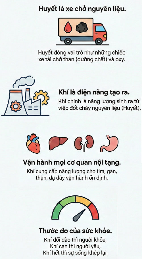 Nếu Huyết là những chiếc xe tải chở nguyên liệu, thì Khí chính là năng lượng được sinh ra từ quá trình chuyển hóa các nguyên liệu đó.